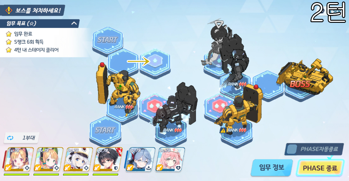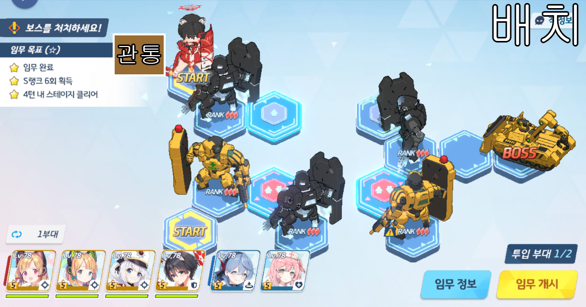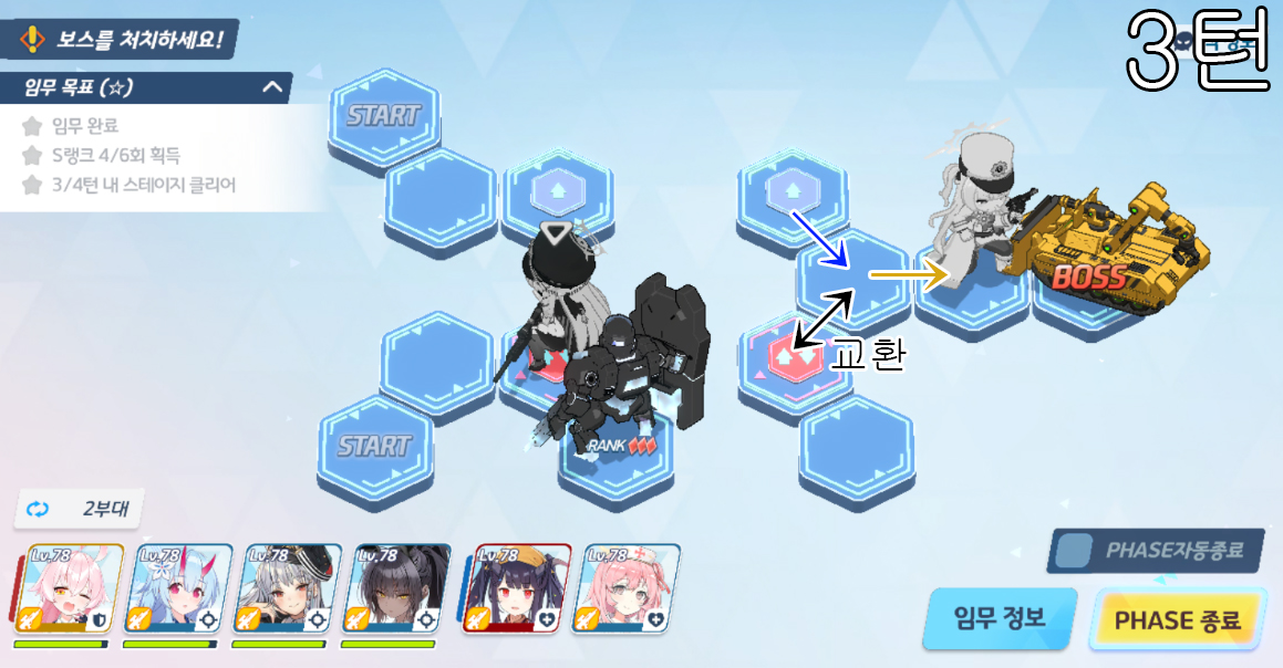 불인의 마음 챌린지4 소용돌이 촬영장 7구역 배치 체리노 위치 => 관통 보스 1팀 하루카 위치 => 폭발 1팀 하루나 위치 => 신비 1팀 1턴 체리노 관통 + 하루나 신비 + 하루카 폭발 1칸씩 이동합니다. 2