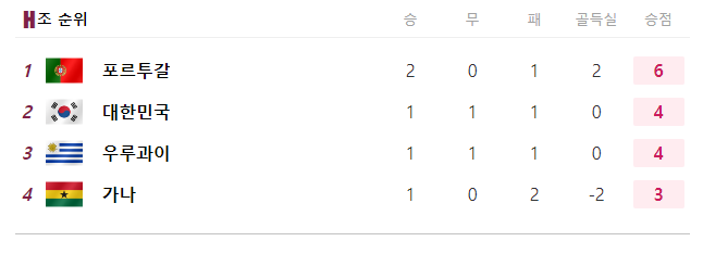 대한민국 2위 (다득점 가나 2골 + 포르투갈 2골)