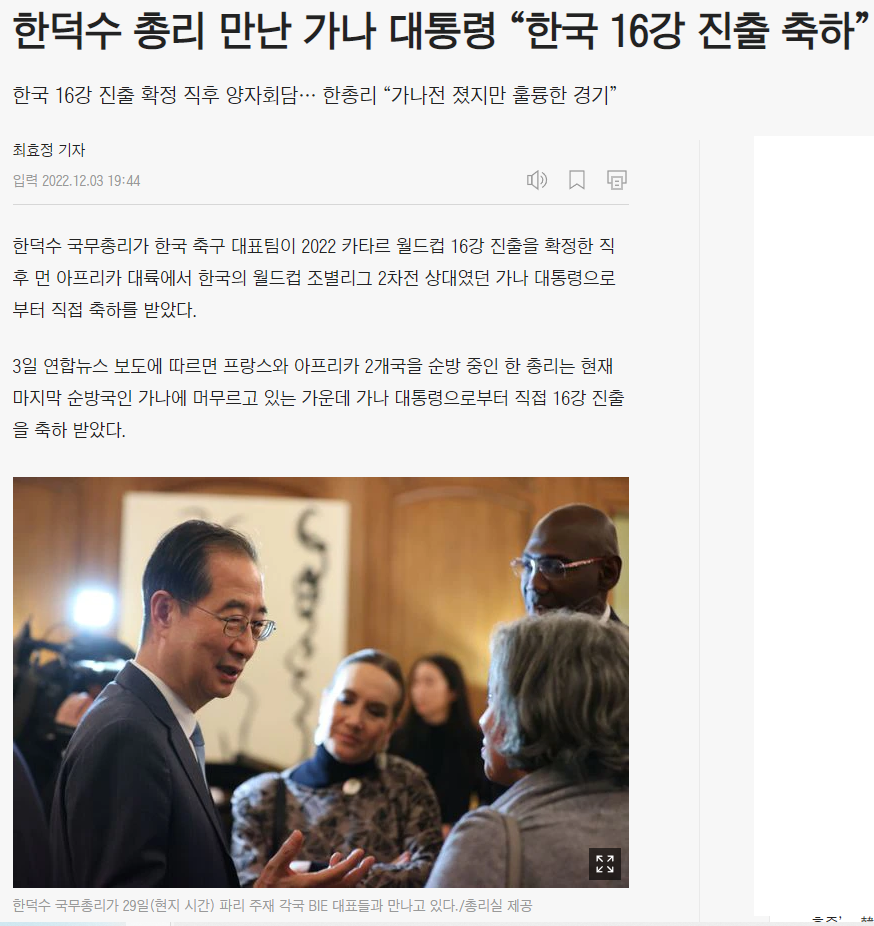 한덕수 총리 만난 가나 대통령 "한국 16강 진출 축하"