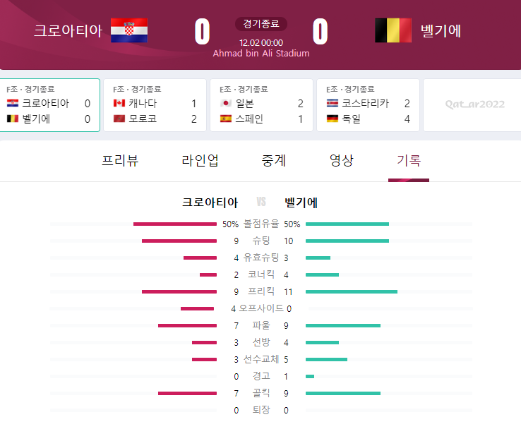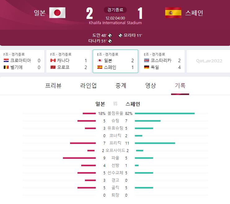 2022 카타르 월드컵 13일차 경기결과 대한민국 2 VS 1 포르투갈 볼점유율 포르투갈 우세 슈팅 동점 유효슈팅 동점 코너킥 대한민국 우세 프리킥 대한민국 우세 오프사이드 대한민국 우세 파울 대한