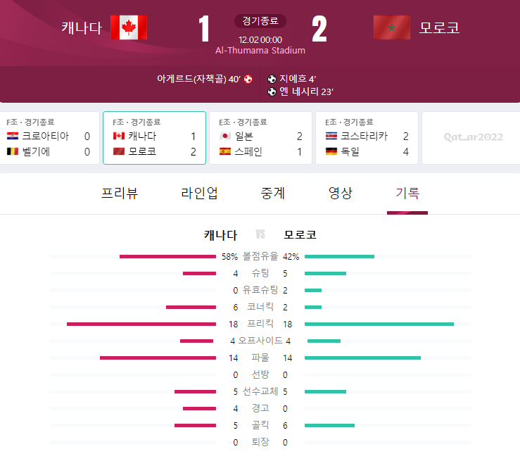 유효슈팅 모로코 우세 (모로코 아게르드 MF 자책골) (유효슈팅 0개)