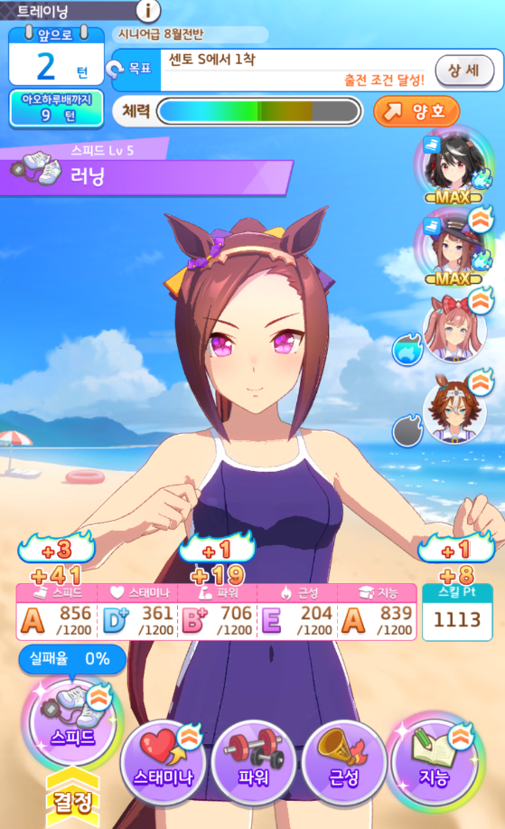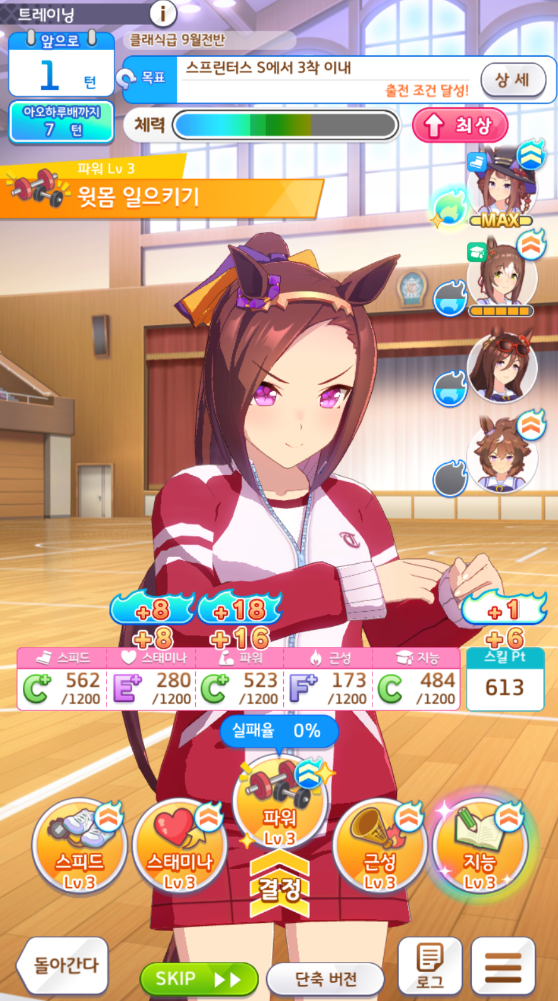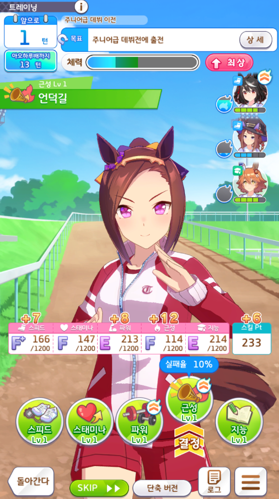 스피드 1200 / 스태미나 700~800 / 파워 700~1200 / 근성 300~400 / 지능 600~1200