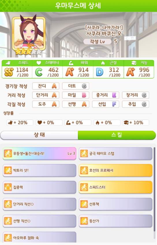 스피드 1200 / 스태미나 500~600 / 파워 901~1200 / 근성 300~400 / 지능 601~1200