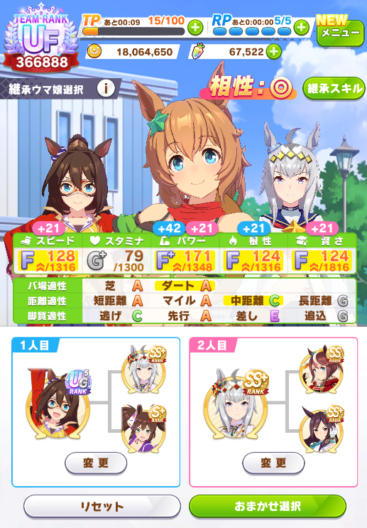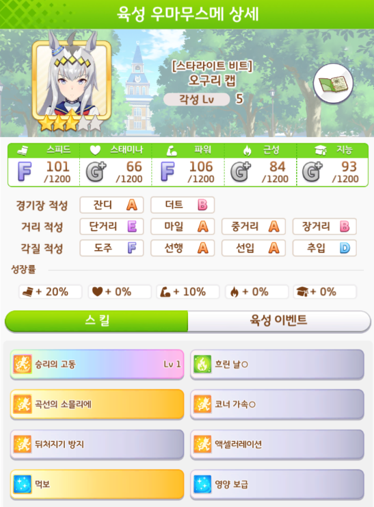 스피드 1200 / 스태미나 900~1200 / 파워 900~1200 / 근성 300~600 / 지능 300~600