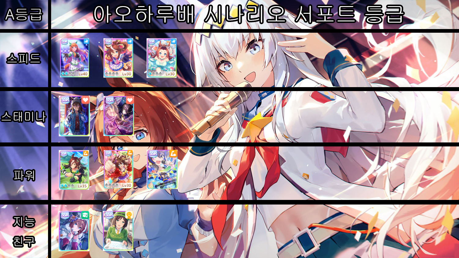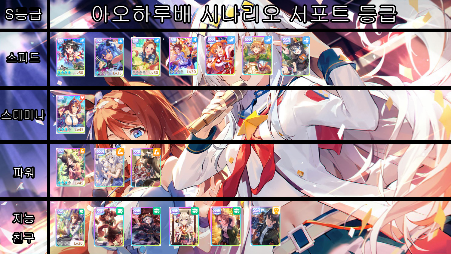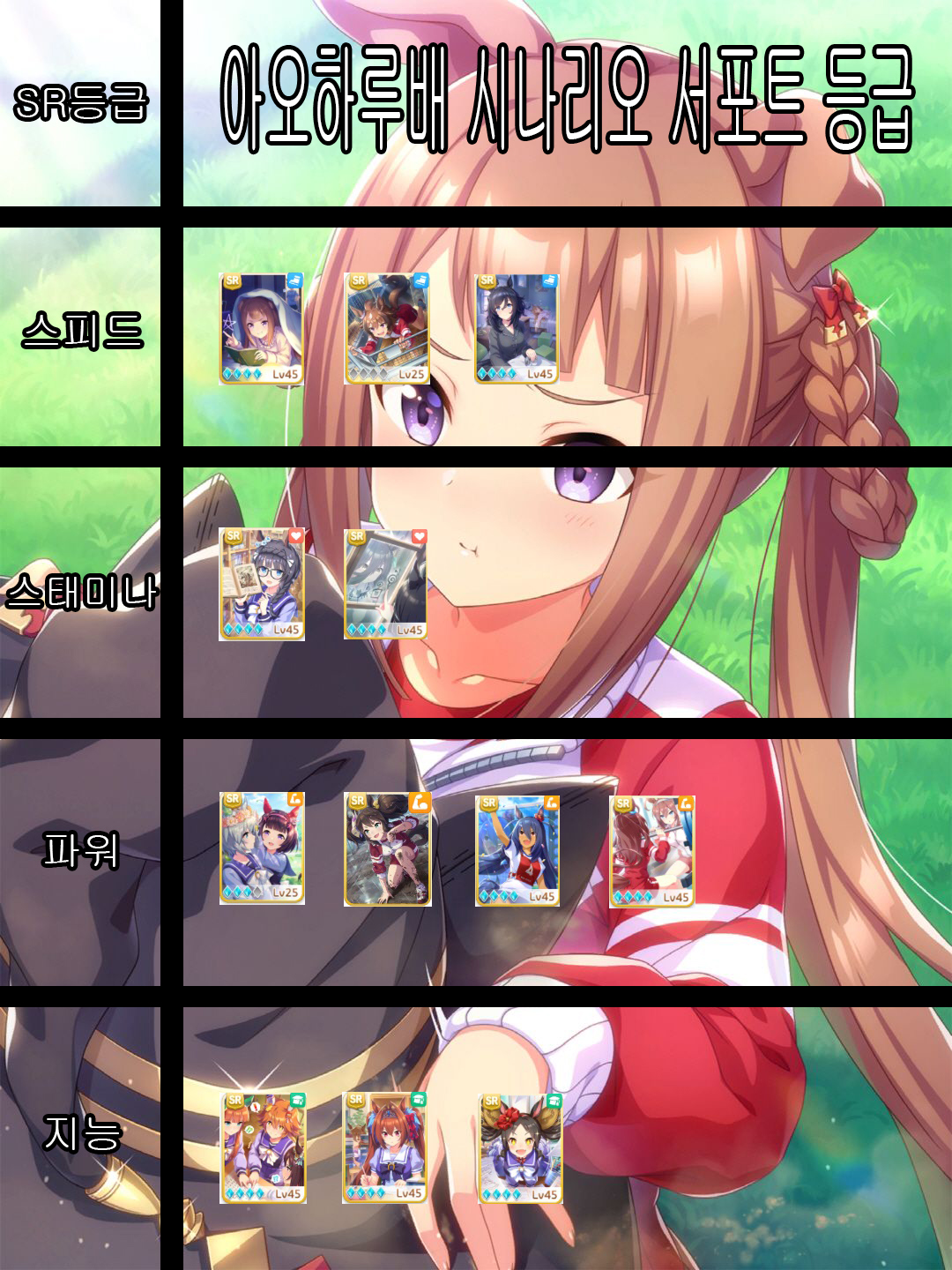 아오하루배 시나리오 육성 공략 팁 초보 우린이 뉴비용 서포트 편성 추천 카드 단거리 마일 더트 편성입니다. 스피드2 + 지능3 + 친구1 스피드2 + 파워1 + 지능2 편성합니다. R 카시모토 리코(친구)