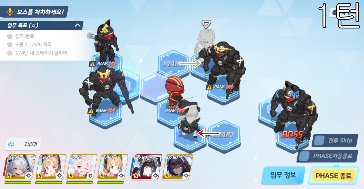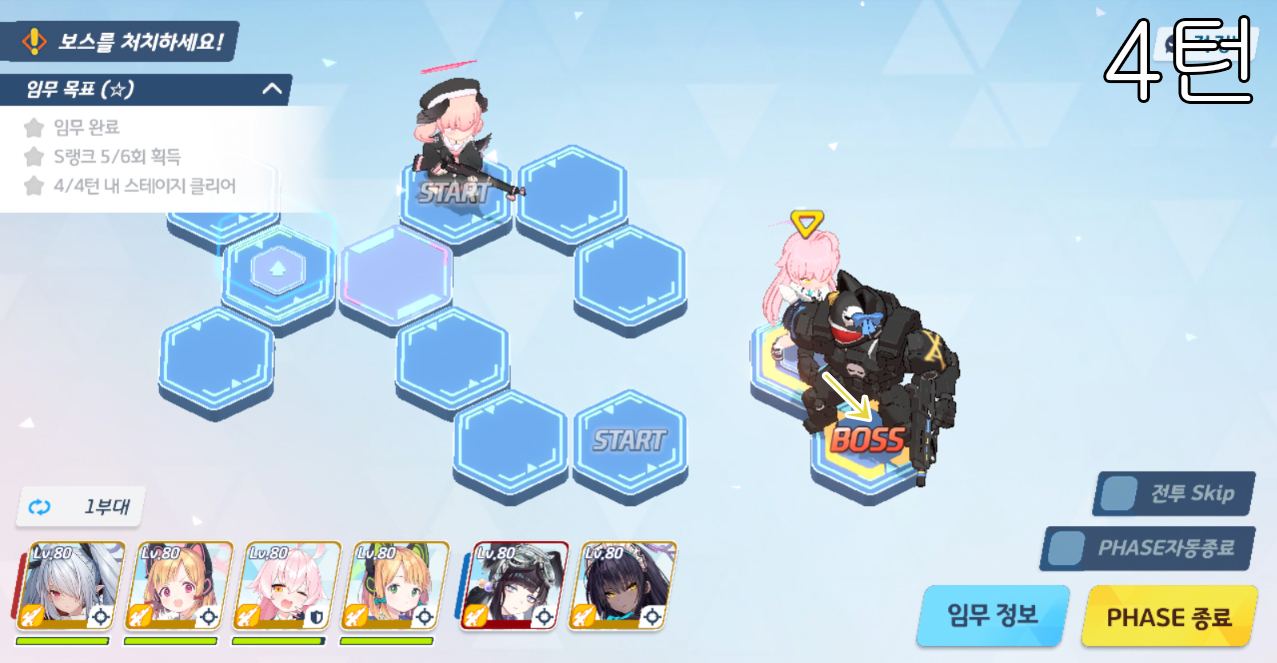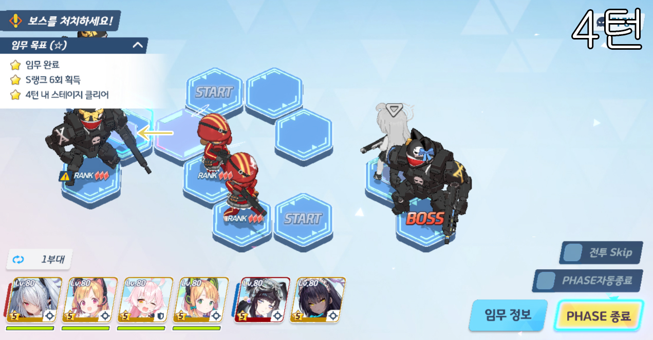아비도스 리조트 복구 대책위원회 챌린지4 바닷바람 해변 배치 코하루 위치 => 폭발 보스 1팀 수히나 위치 => 폭발 쫄 1팀 호시노 위치 => 관통 1팀 1턴 코하루 폭발 오른쪽으로 1칸 이동 호시노 관