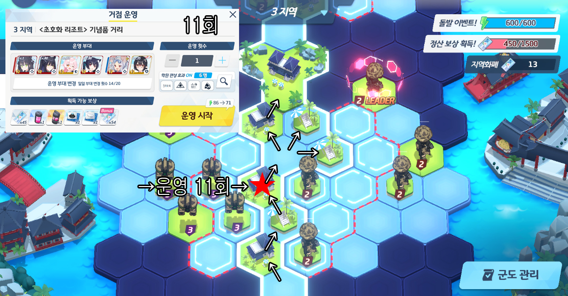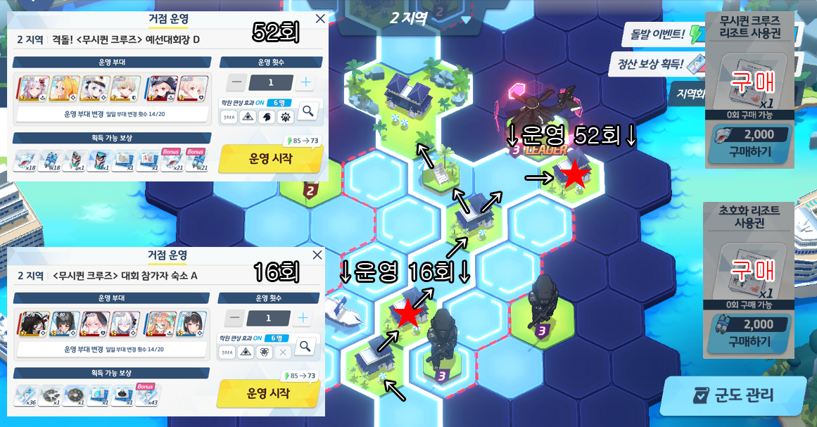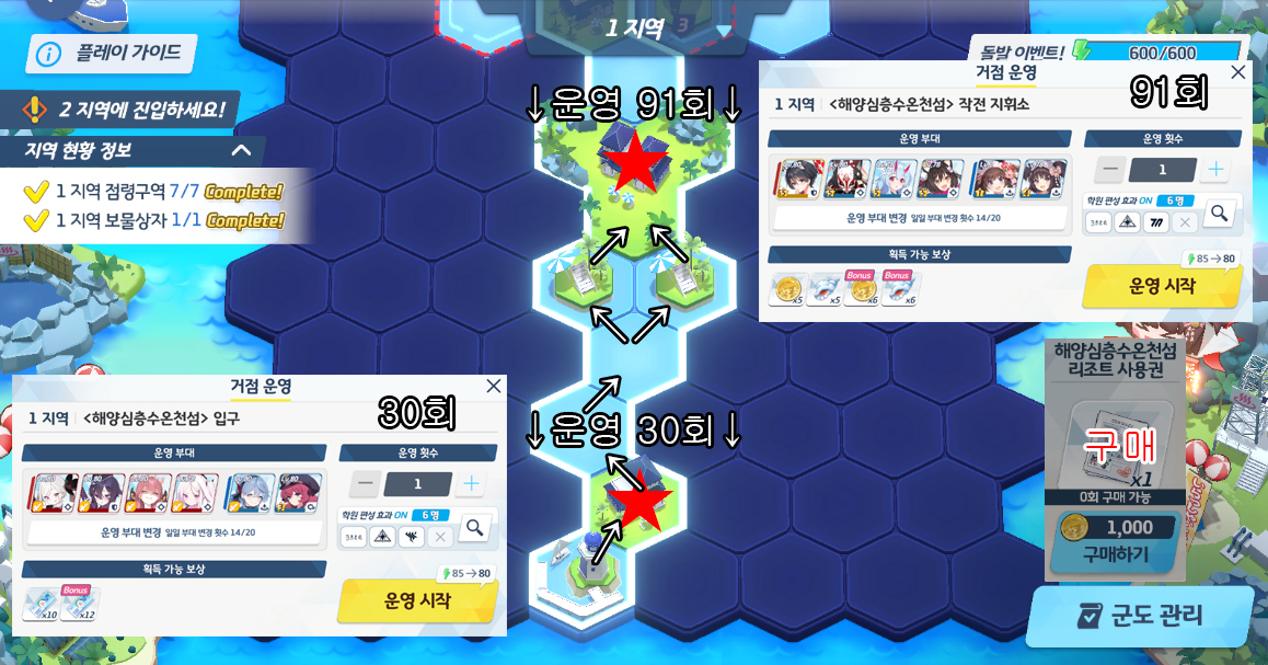 복각 출장! 백야당 AP 최소 루트 공략 1지역 소탕 91회 (120%) 백귀야행 아비도스 게헨나 해양심층수온천섬 리조트 사용권 구매 2지역 소탕 52회 (120%) 백귀야행 아비도스 SRT 붉은겨울 여름용 인법도