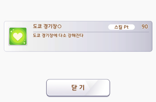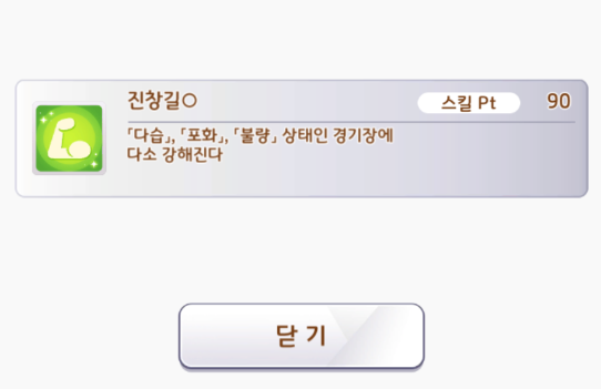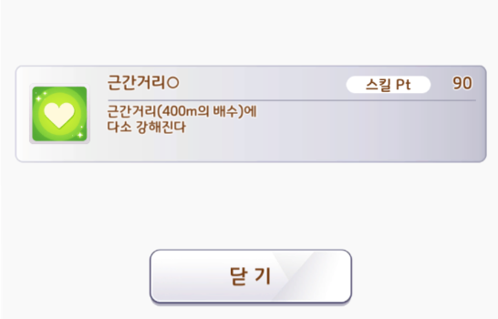 스피드 1200 / 스태미나 700~800 / 파워 700~1200 / 근성 300~400 / 지능 700~1200