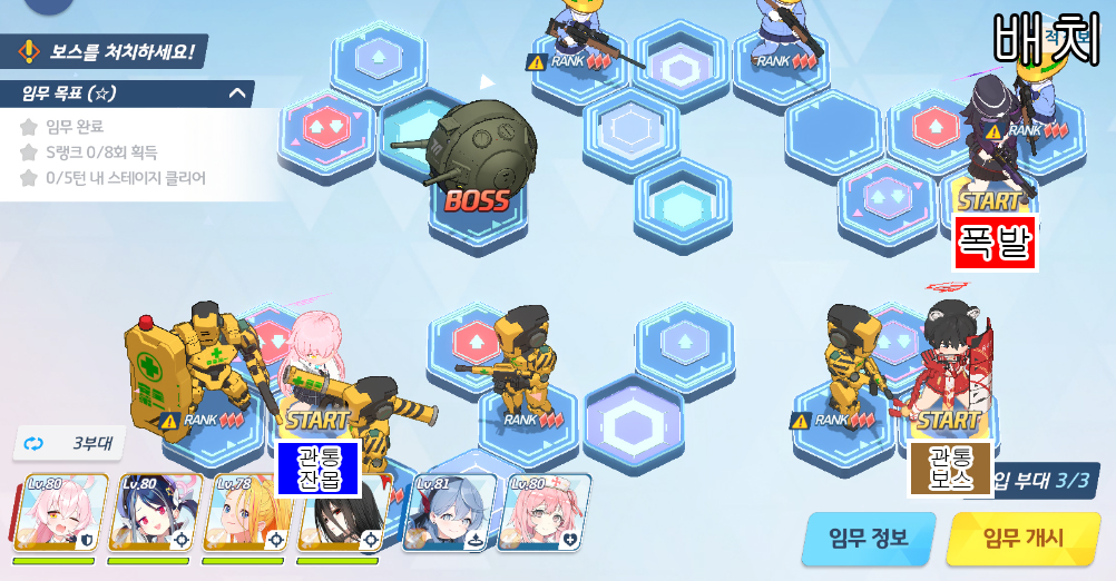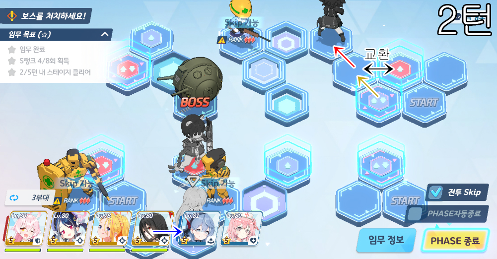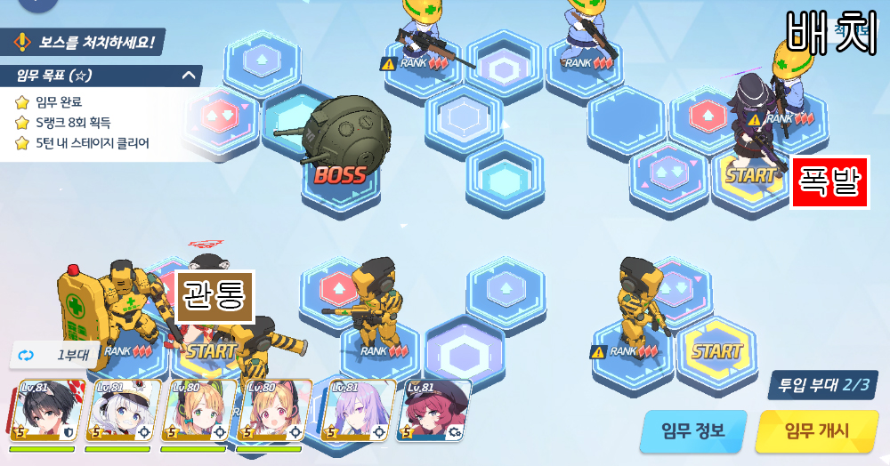 키보토스 황륜대제 챌린지2 제2스포츠센터 배치 츠바키 위치 => 관통 보스 1팀 하루카 위치 => 폭발 1팀 1턴 하루카 오른쪽 1칸 이동 후 텔레포트 사용 츠바키 오른쪽 1칸 이동 2턴 하루카가 먼저 오