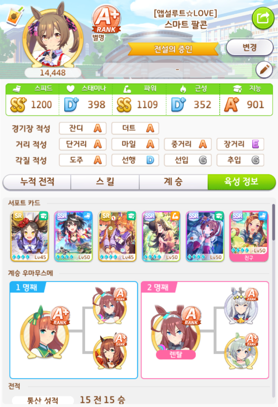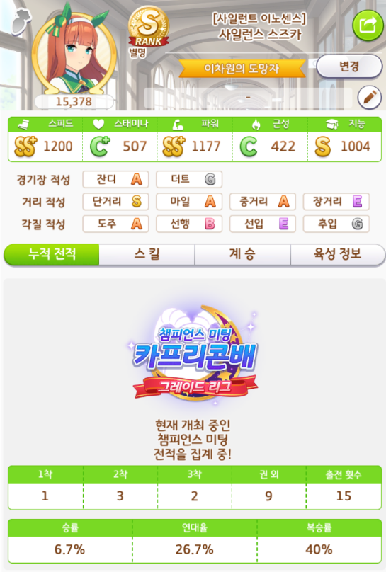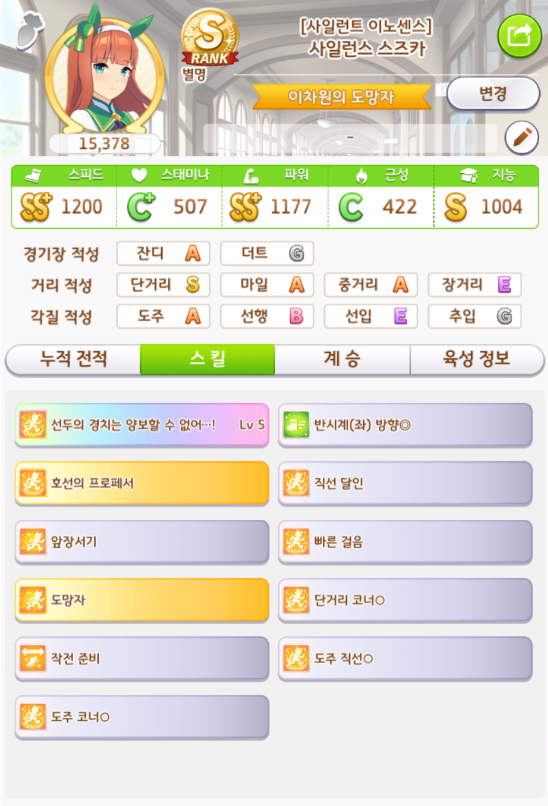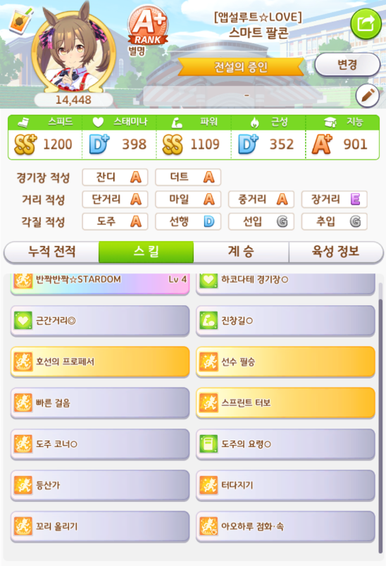 단거리S + 잔디S + 등급 점수 + 스킬