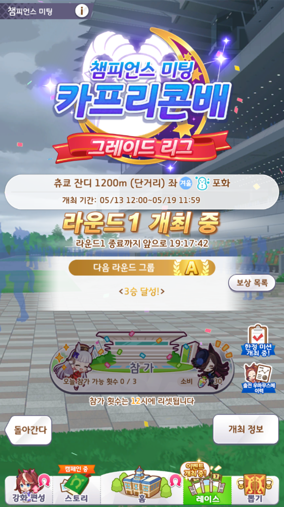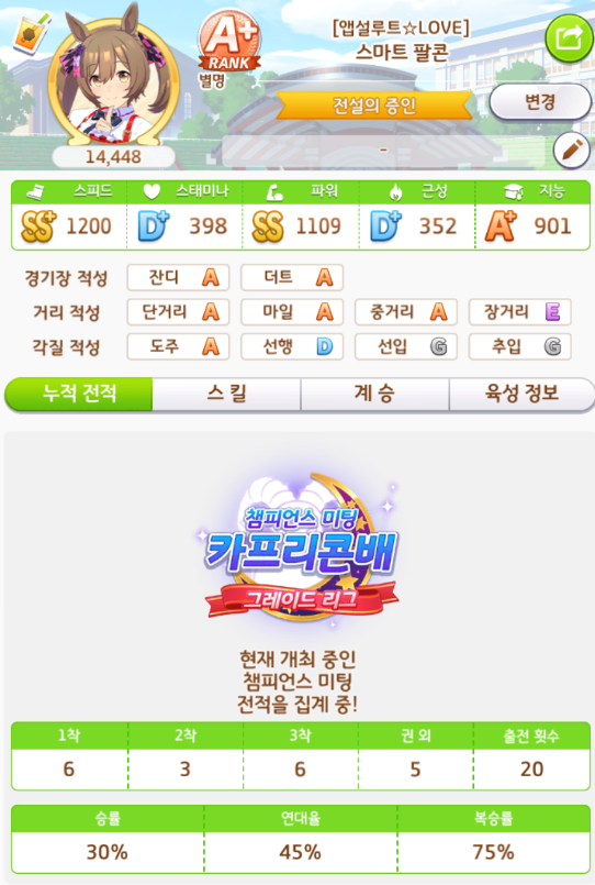 단거리 챔피언스 미팅 최소 추천 스태미나 능력치 => 450