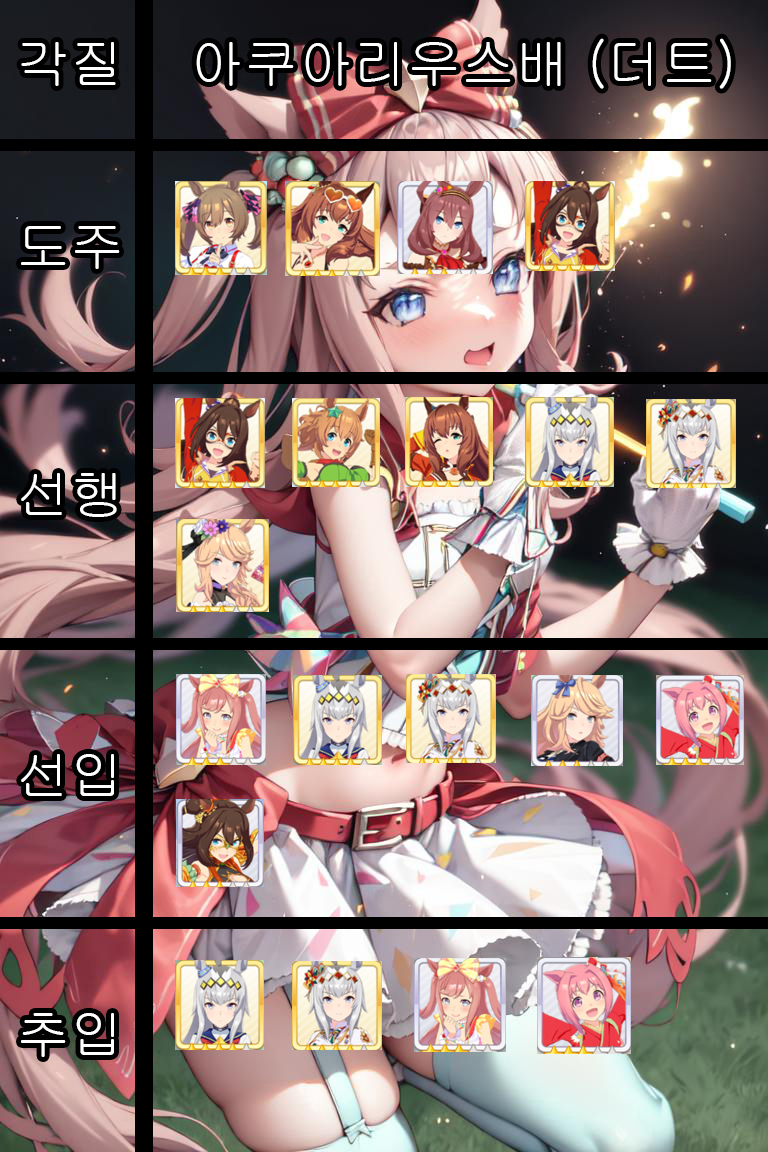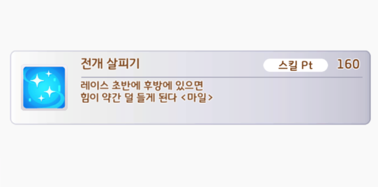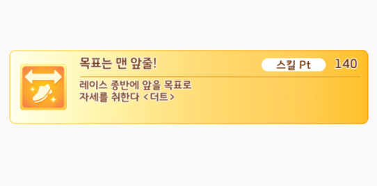 더트 스킬 목표는 맨 앞줄 레이스 종반에 앞을 목표로 자세를 취한다 발동 조건 더트 / 레이스 종반 무작위 효과 포지션 0.035 / 가속 상승 0.3 / 지속 시간 3초 앞줄 겨냥 레이스 종반에 다소 앞을