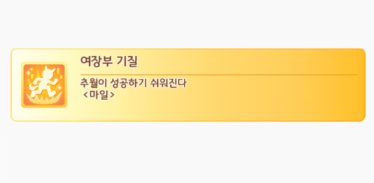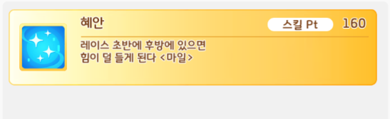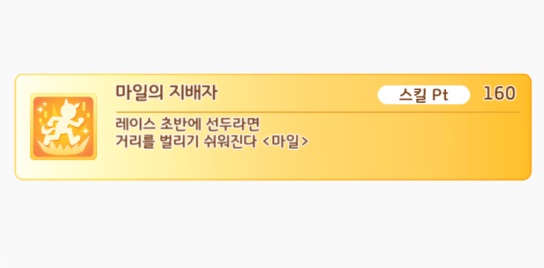 마일 스킬 마일 직선 직선에서 속도가 약간 상승한다 발동 조건 마일 / 무작위 직선 효과 속도 상승 0.15 or 0.25 / 지속 시간 3초 마일 코너 코너에서 속도가 약간 상승한다 발동 조건 마일 / 무작위