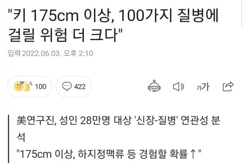 "키 175cm 이상, 100가지 질병에 걸릴 위험 더 크다"