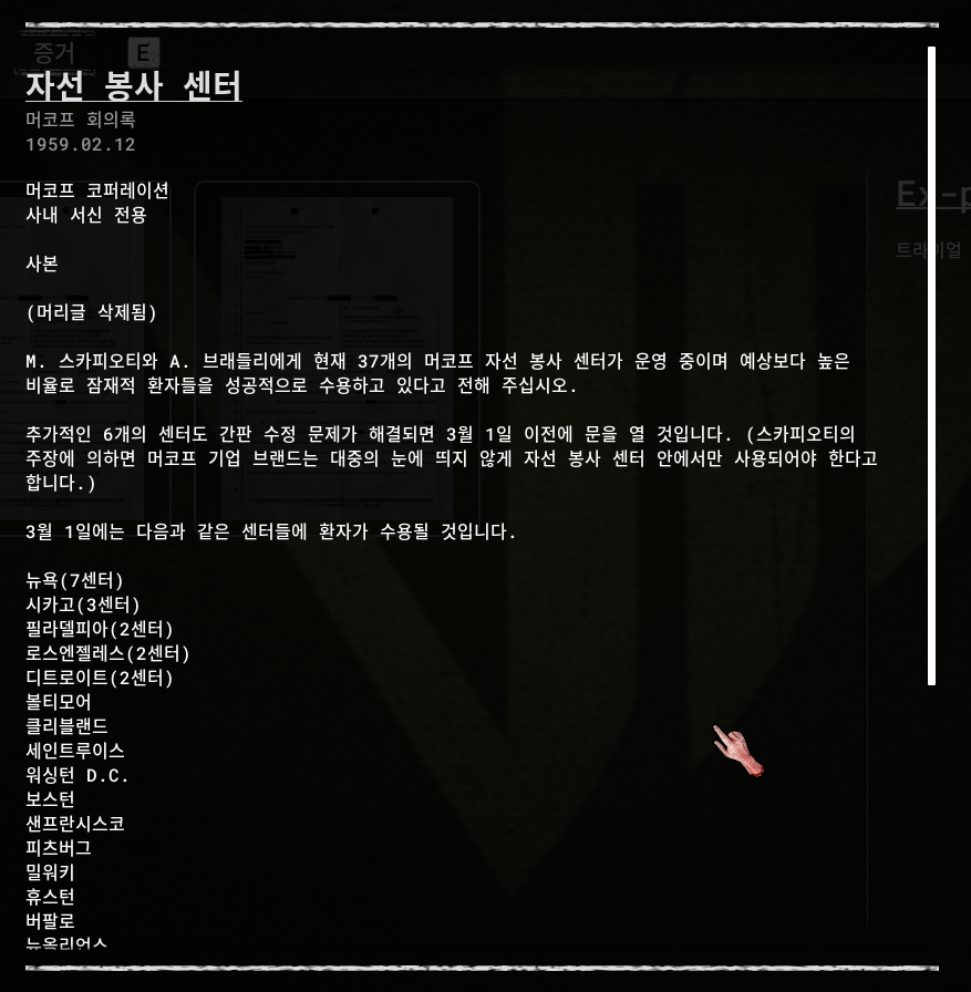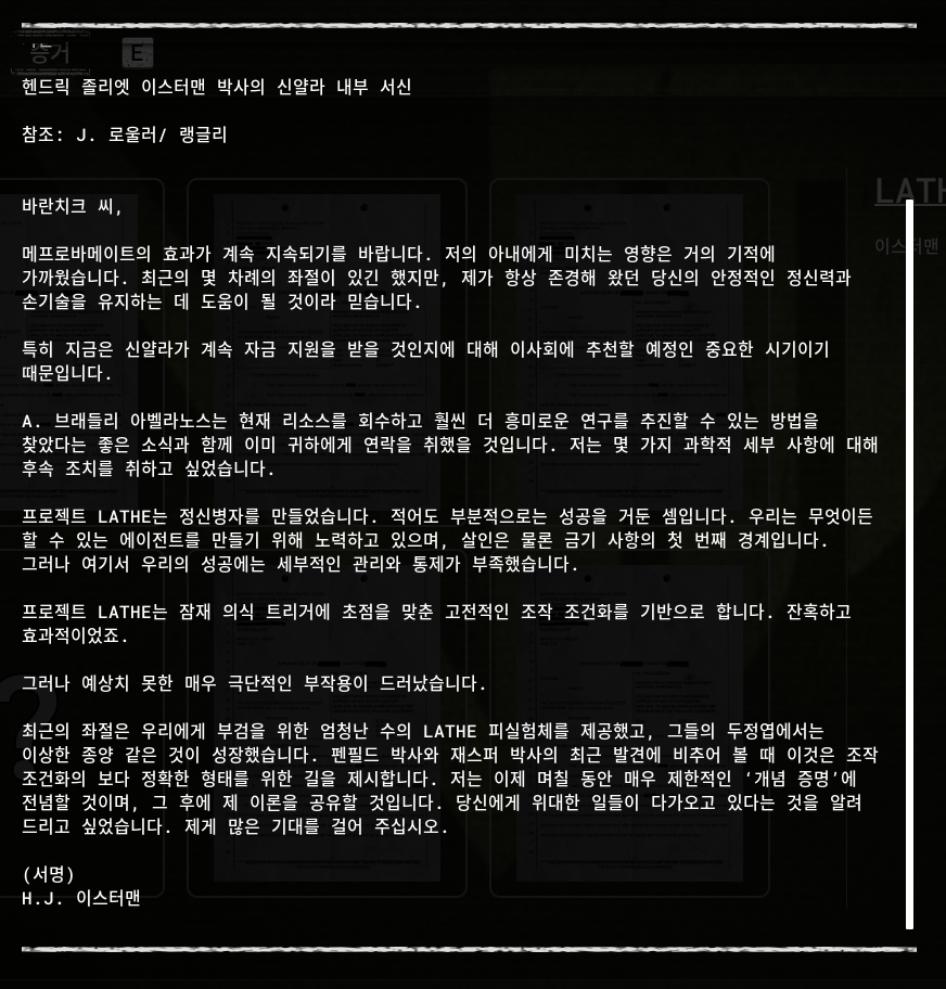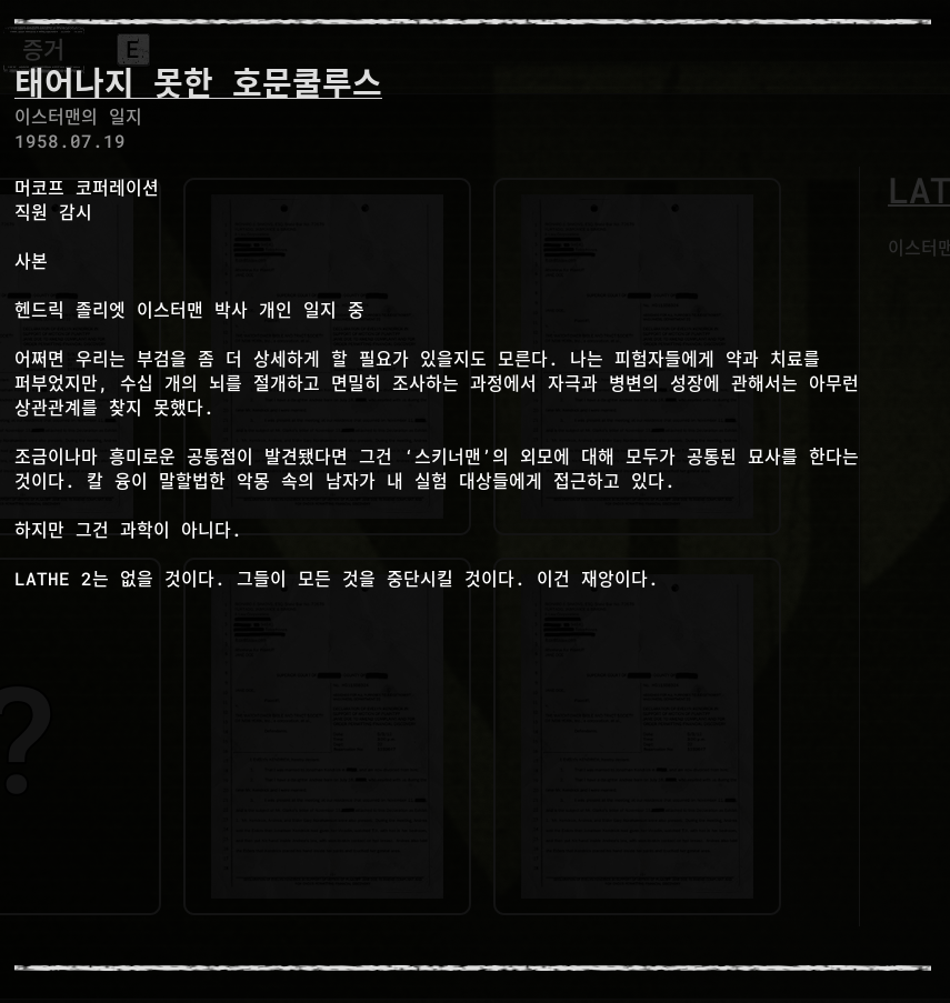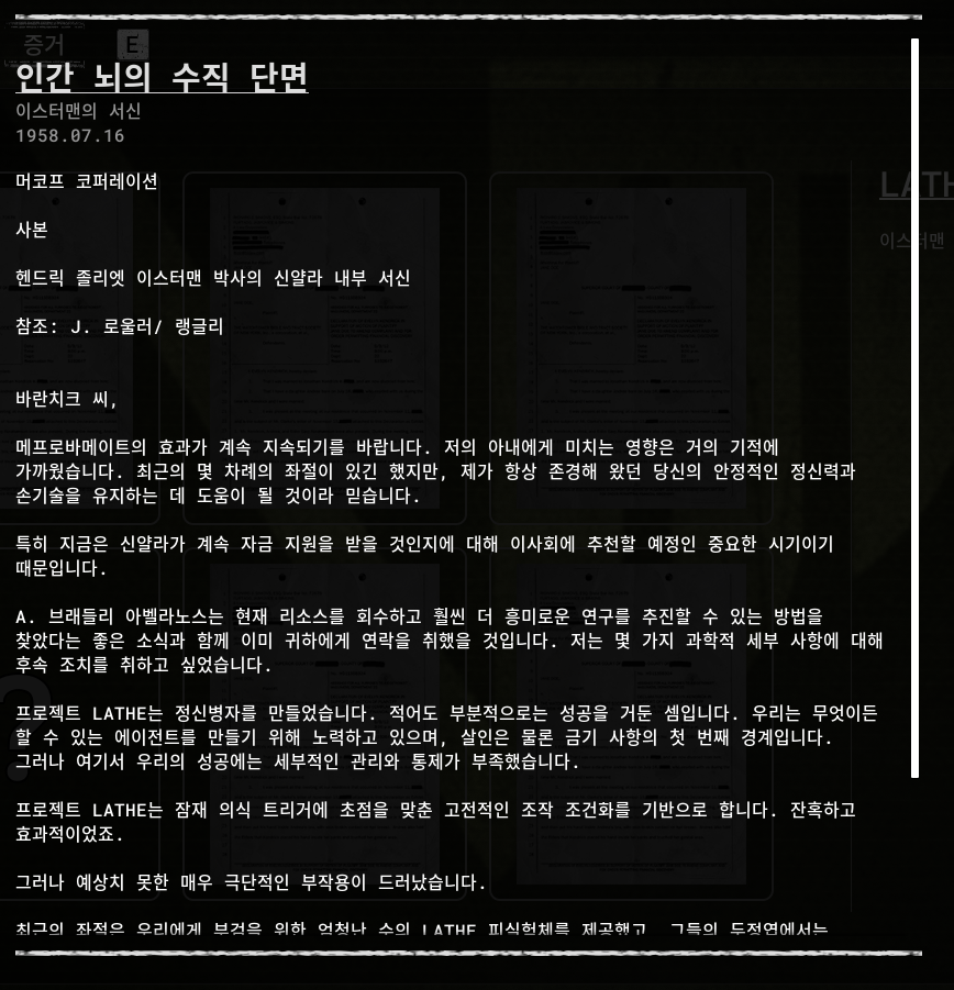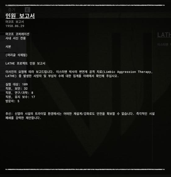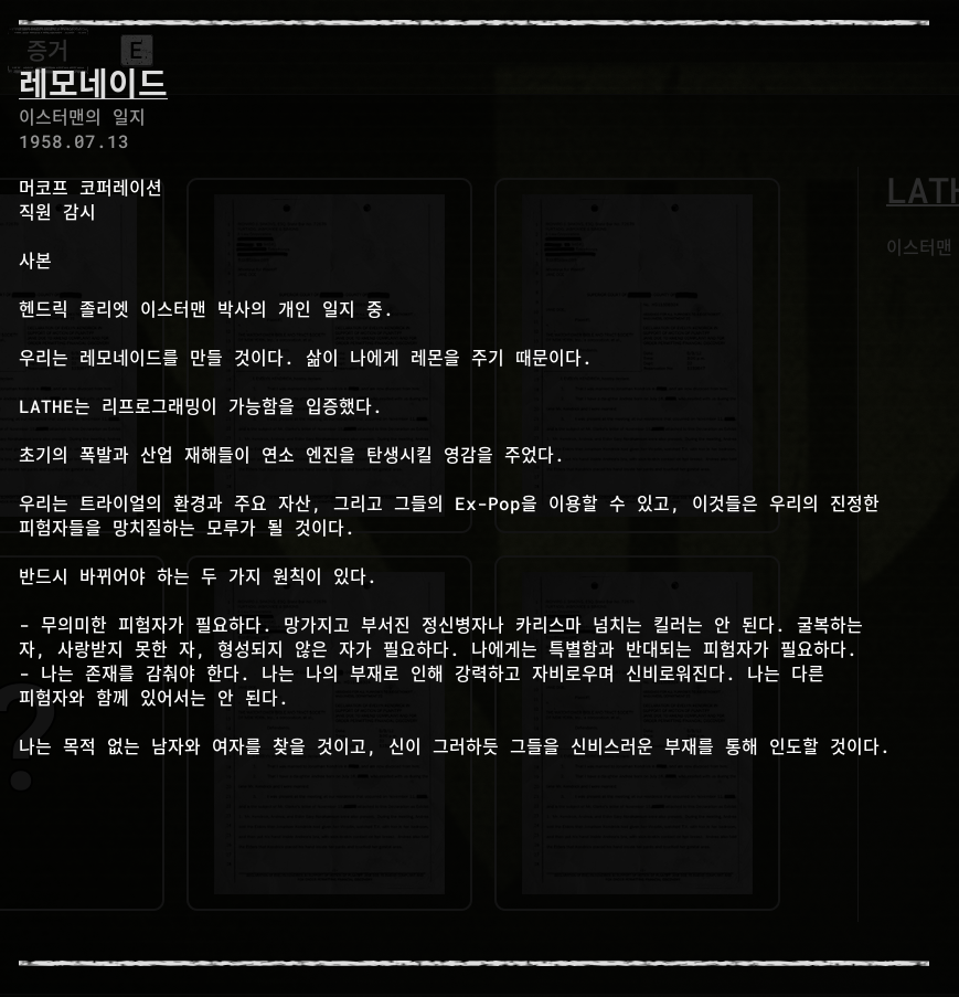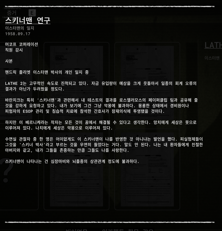 세계관 스토리 라인 증거 정보 [2] 더 아웃라스트 트라이얼 (THE OUTLAST TRIALS)의 세계관 스토리 라인은 증거(아이템)을 획득을 해서 알 수 있습니다. 자료를 모아서 정리했습니다. 스토리라인 05 LATHE