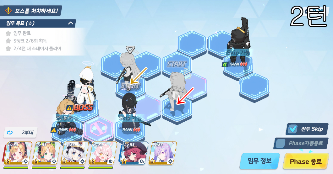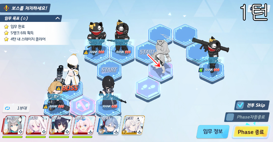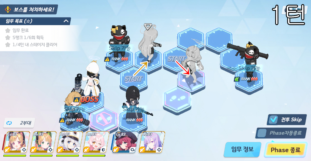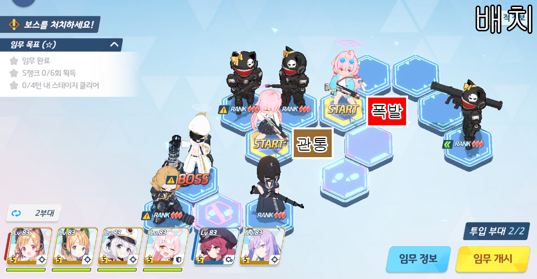 성당의 메리 크리스마스 챌린지4 D.U. 서쪽 거리 2번가 배치 수시노 위치 => 폭발 보스 1팀 에이미 위치 => 폭발 잔몹 1팀 호시노 위치 => 관통 1팀 1턴 수시노 왼쪽 1칸 이동 호시노 왼쪽 1칸 이동 에