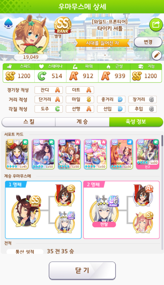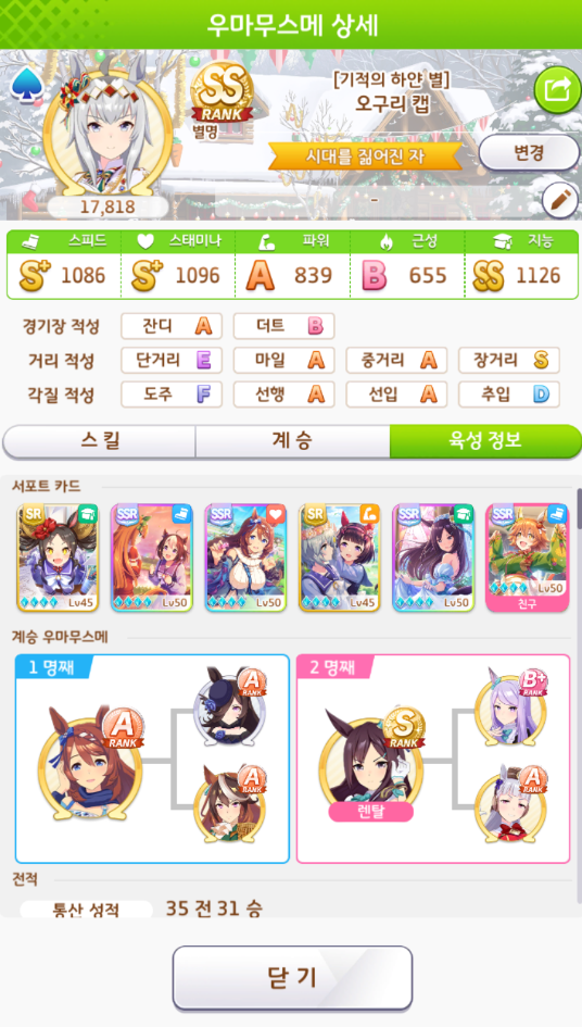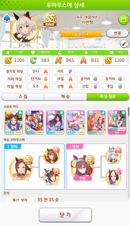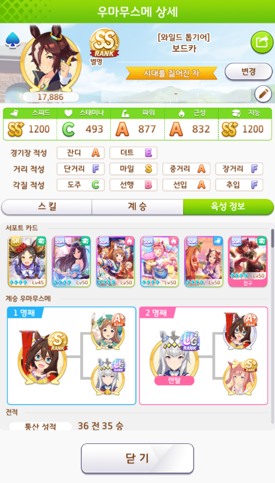 육성을 레이스 보너스 60% 맞추도록 노력해서 육성을 추천합니다.