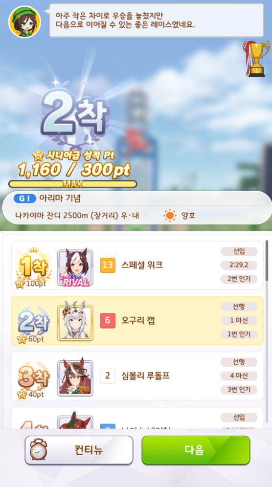 G1 경기 1착을 실패해서 컨티뉴를 사용했습니다.