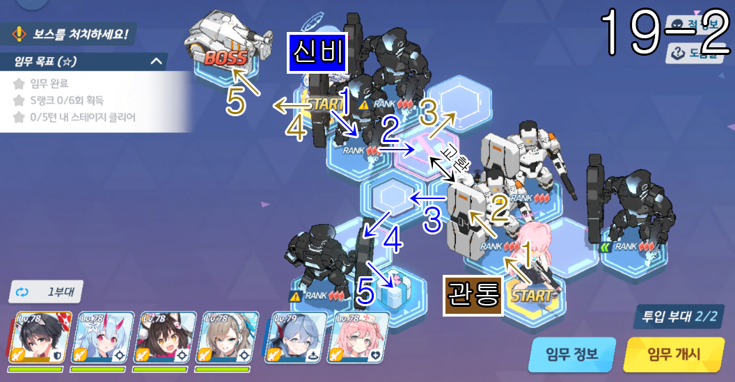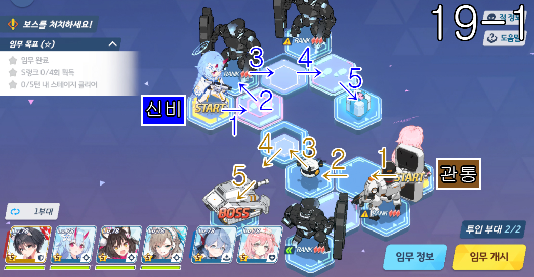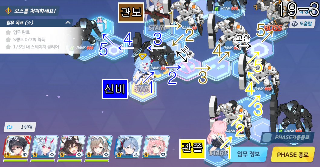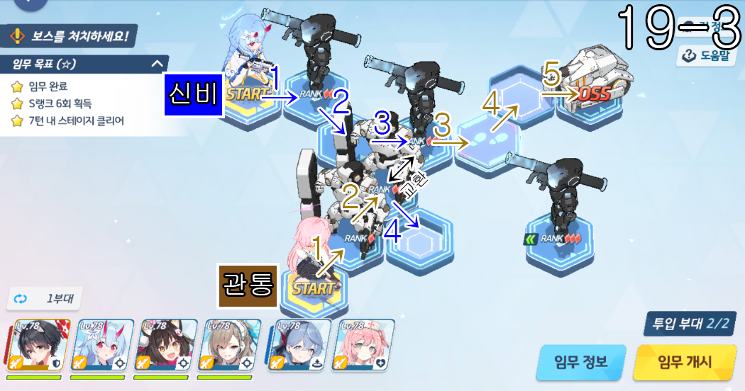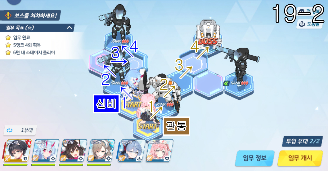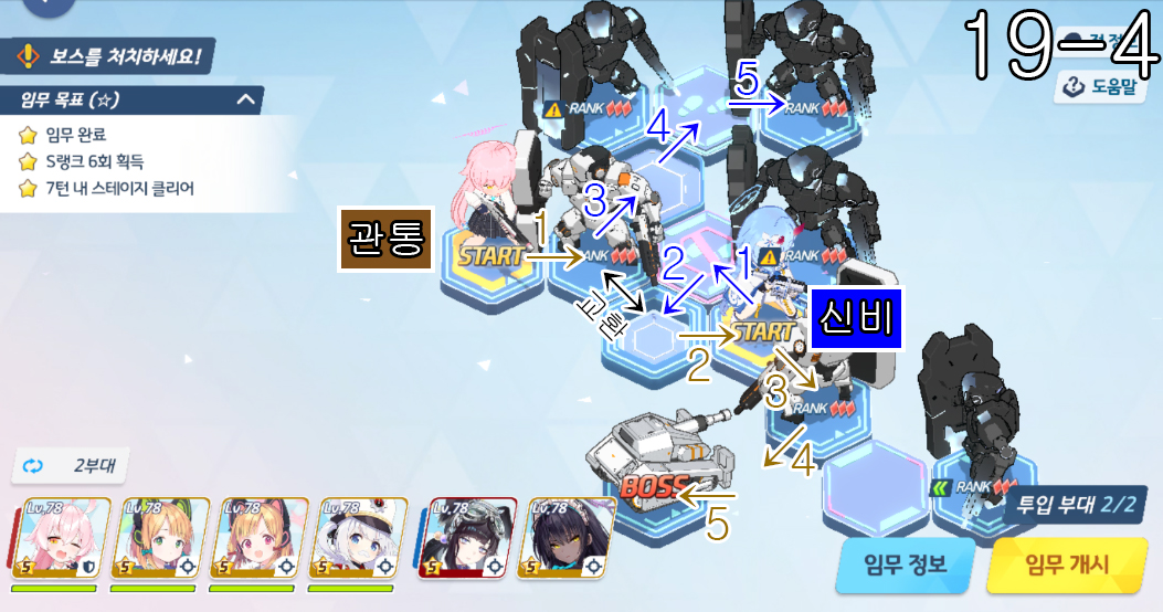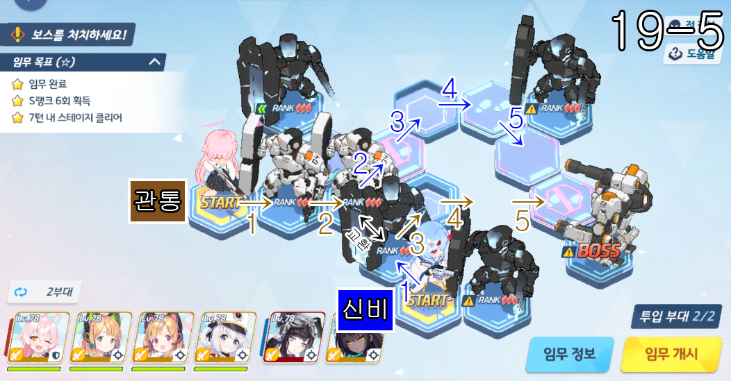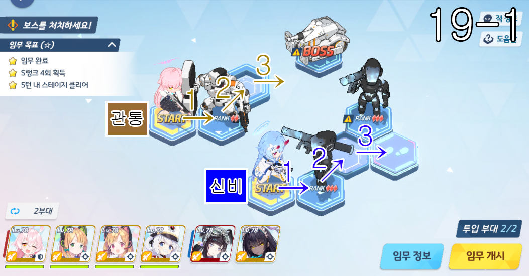 20지역 노멀 + 하드 노멀 노멀 20-1 3턴째에서 호시노 관통 팀이 움직이지 않고 턴을 종료합니다. 노멀 20-2 쫄 5팀 + 보스 1팀 => 총 6팀을 잡습니다. S랭크 5회 임무 목표 부담이 조금 적습니다. 노멀 2