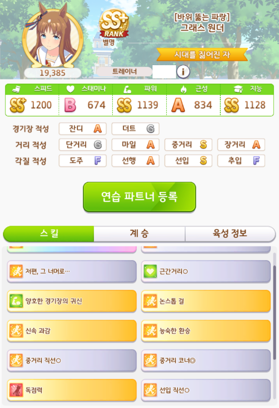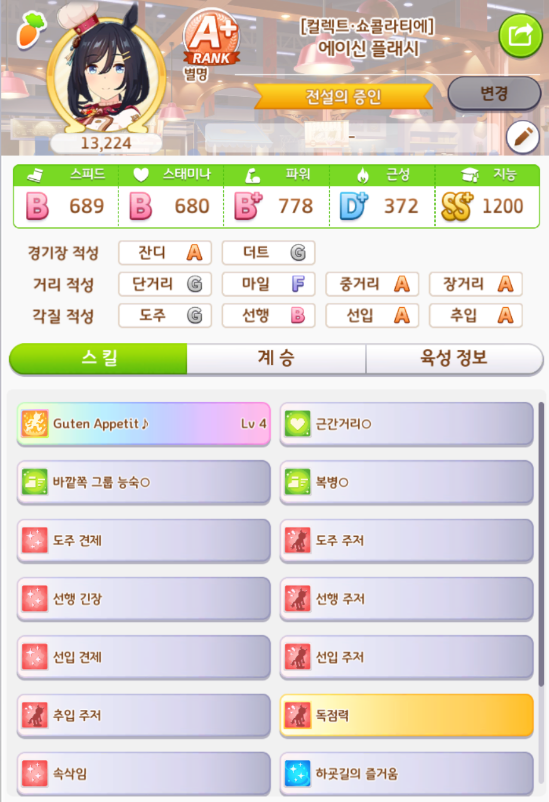 스피드1200 / 스태미나 900~1000 / 파워 1000↑ / 근성 600 / 지능 1000↑