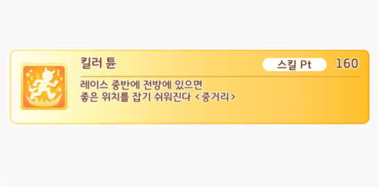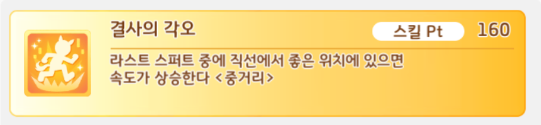 중거리 스킬 정보 중거리 직선 직선에서 속도가 약간 상승한다 발동 조건 중거리 / 무작위 직선 효과 속도 상승 0.15 or 0.25 / 지속 시간 3초 중거리 코너 코너에서 속도가 약간 상승한다 발동 조건