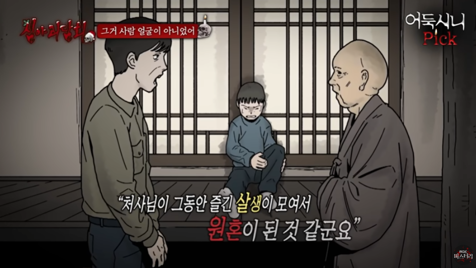 스님 : "처사님이 그동안 즐긴 살생이 모여서 원혼이 된 것 같군요"