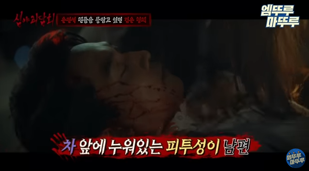 차 앞에 누워있는 피투성이 남편