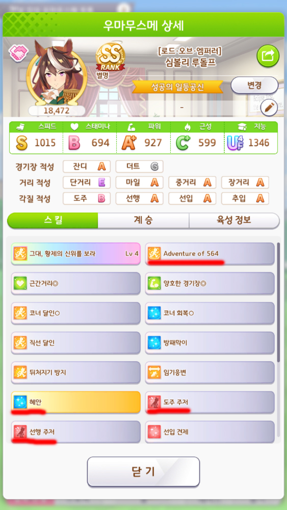 스피드 1500↑ / 스태미나 600↑ / 파워 1000↑ / 근성 600↑ / 지능 1000↑