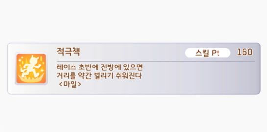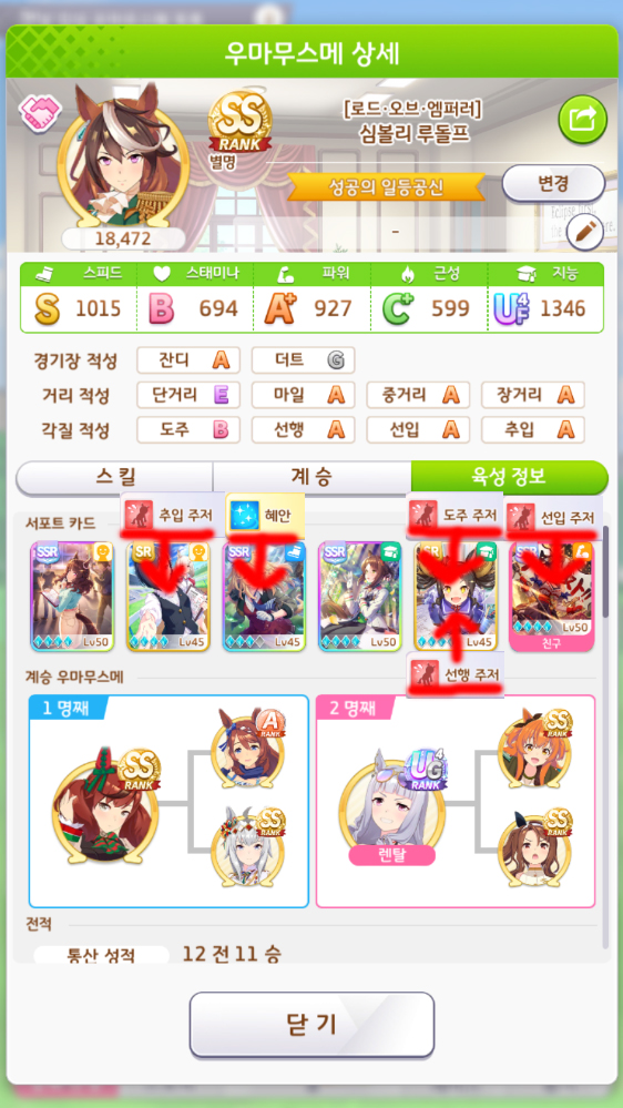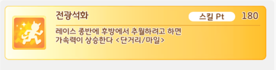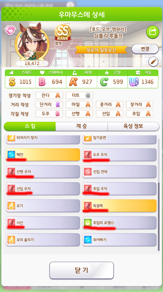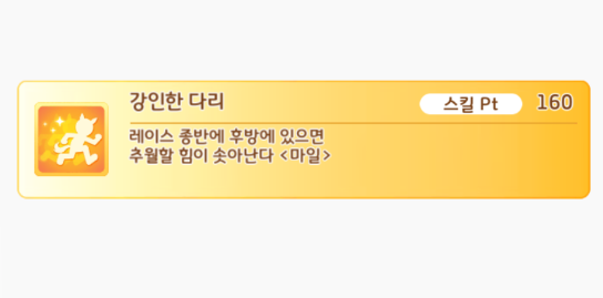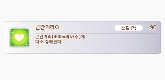 추입 클구리 스피드 1500↑ / 스태미나 450↑ / 파워 1000↑ / 근성 600↑ / 지능 1000↑