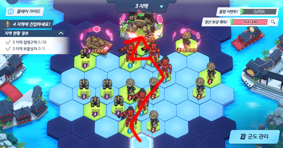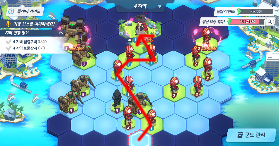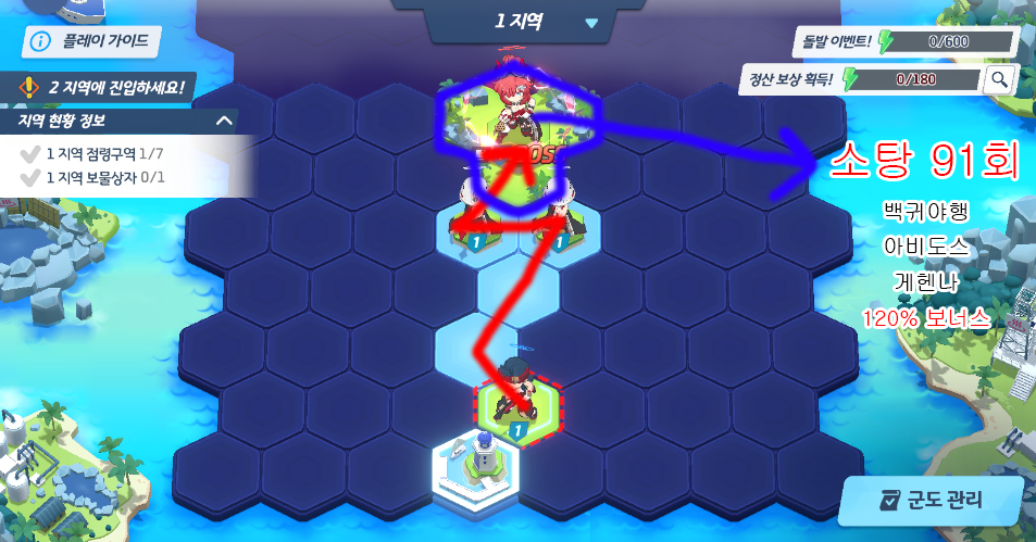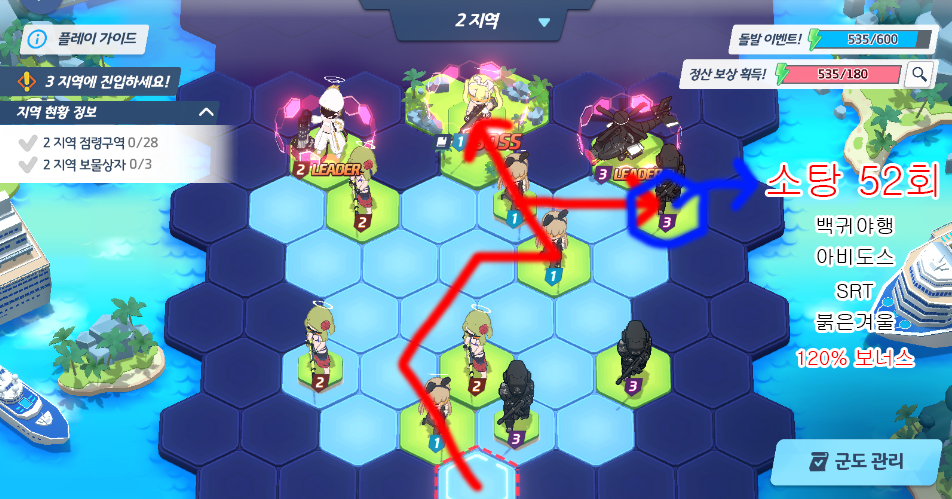 출장! 백야당 바다의 집 프랜차이즈 계획 이벤트 공략 1지역 입구 지역화폐 기본 10개 얻을수 있는 곳에서 운영 부대 편성 6개 맞춰서 120% 만든 후 30회 운영 시작을 합니다. (아래 ★별 지점) 작전