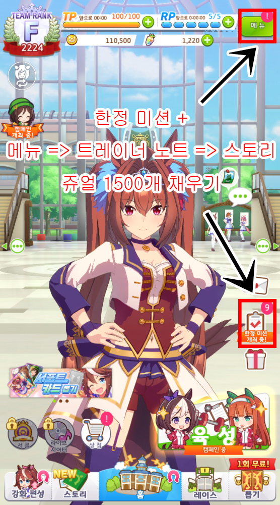 12. 한정미션 + 메뉴(트레이너 노트 => 스토리)로 쥬얼 1500개 모우기