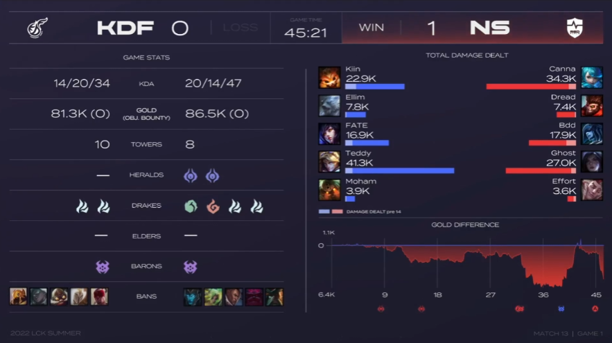 KDA KDF(14 / 20 / 34) VS NS(20 / 14 / 47)