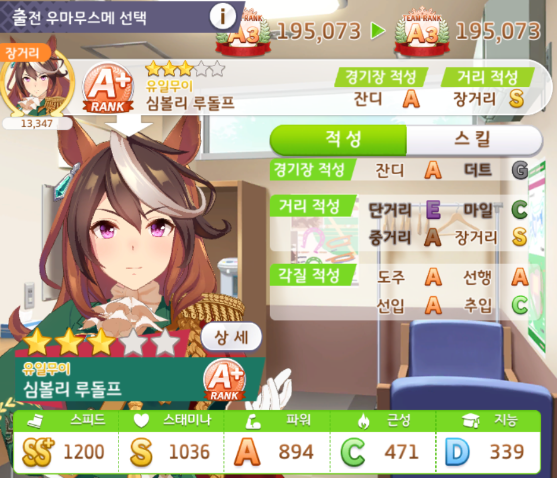 스피드 1200 / 스태미나 600~900 / 파워 600~900 / 근성 400 / 지능 600~900 맞춰줍시다.