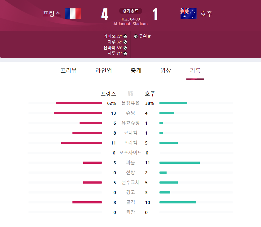 2022 카타르 월드컵 4일차 경기결과 모로코 0 VS 0 크로아티아 볼점유율 크로아티아 우세 슈팅 크로아티아 우세 유효슈팅 동점 코너킥 크로아티아 우세 프리킥 크로아티아 우세 오프사이드 모로코