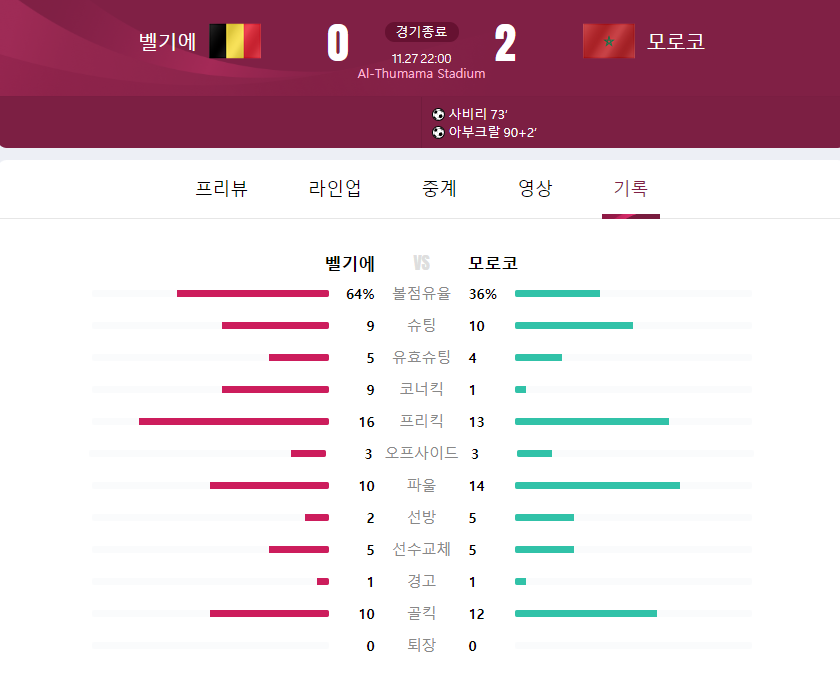 2022 카타르 월드컵 9일차 경기결과 카메룬 3 VS 3 세르비아 볼점유율 세르비아 우세 슈팅 세르비아 우세 유효슈팅 카메룬 우세 코너킥 카메룬 우세 프리킥 카메룬 우세 오프사이드 카메룬 우세 파