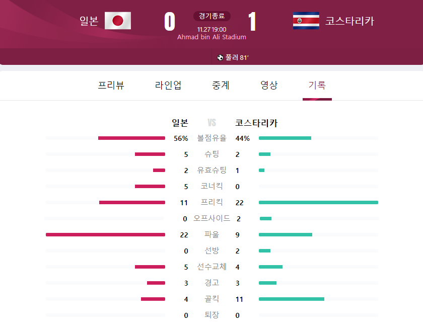 2022 카타르 월드컵 7일차 경기결과 호주 1 VS 0 튀니지 볼점유율 튀니지 우세 슈팅 튀니지 우세 유효슈팅 튀니지 우세 코너킥 튀니지 우세 프리킥 호주 우세 오프사이드 호주 우세 파울 호주 우세