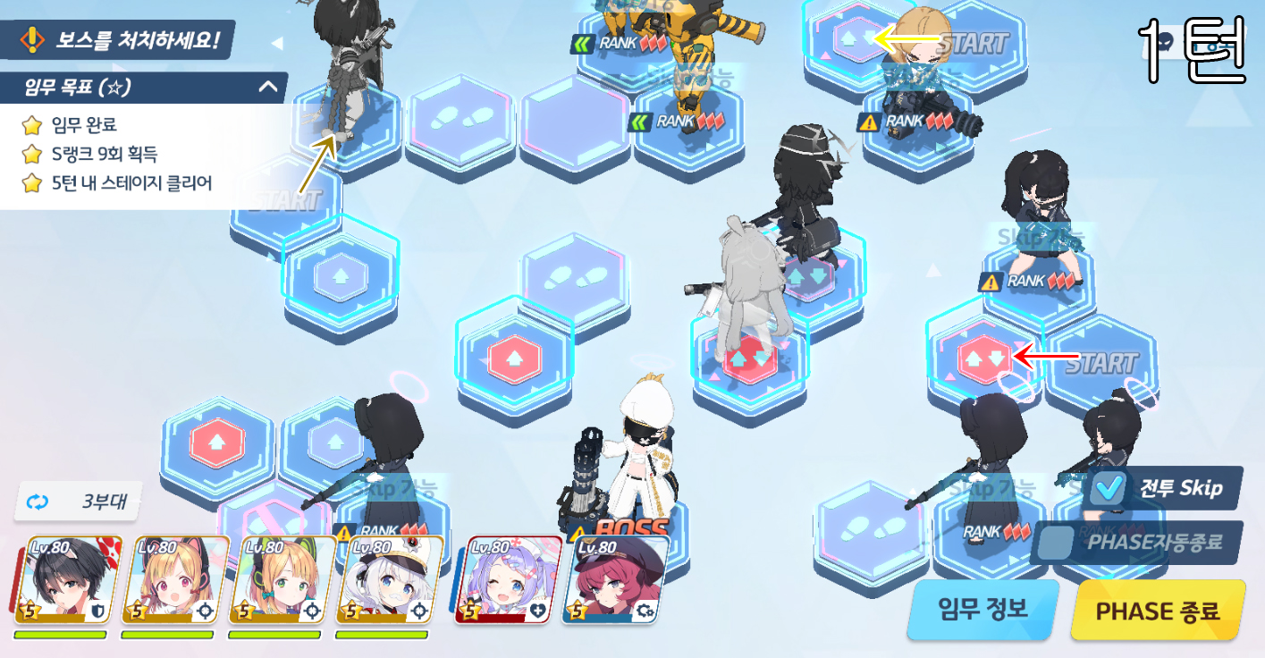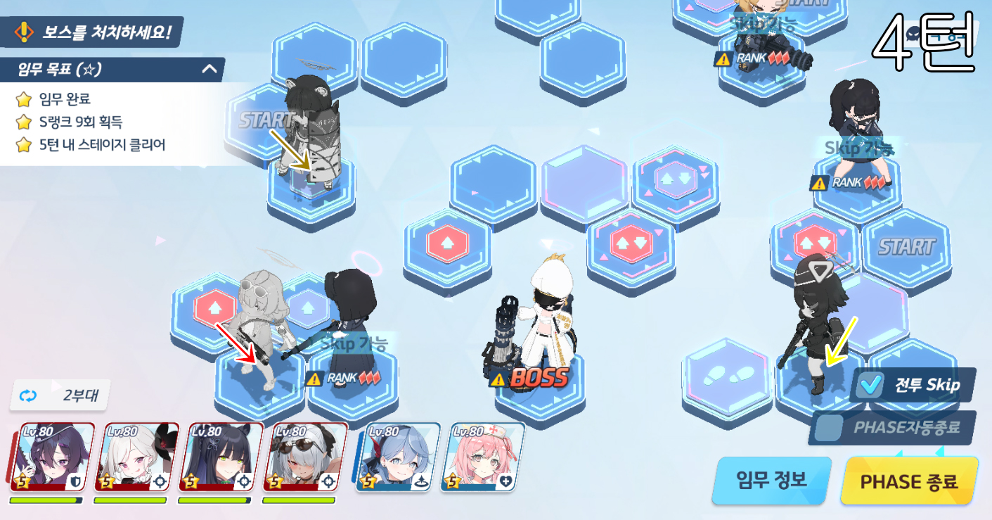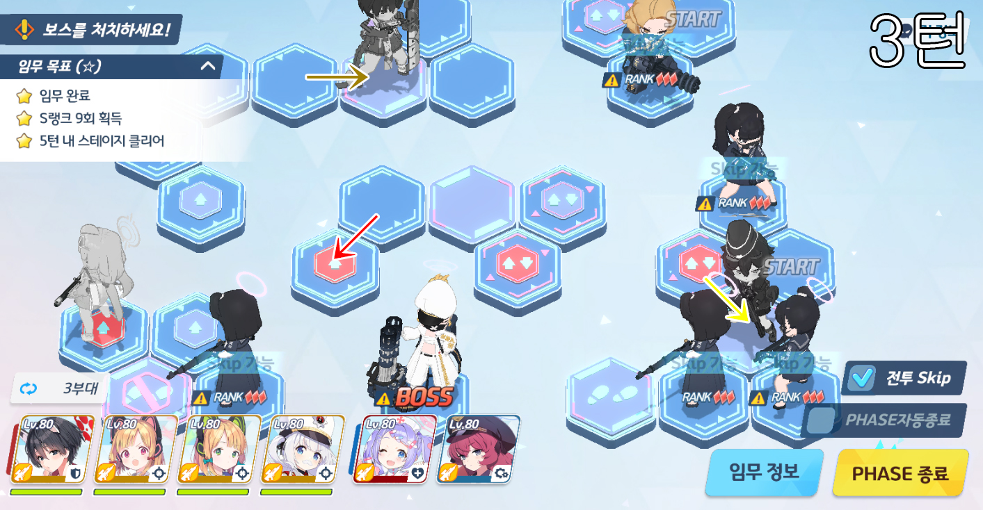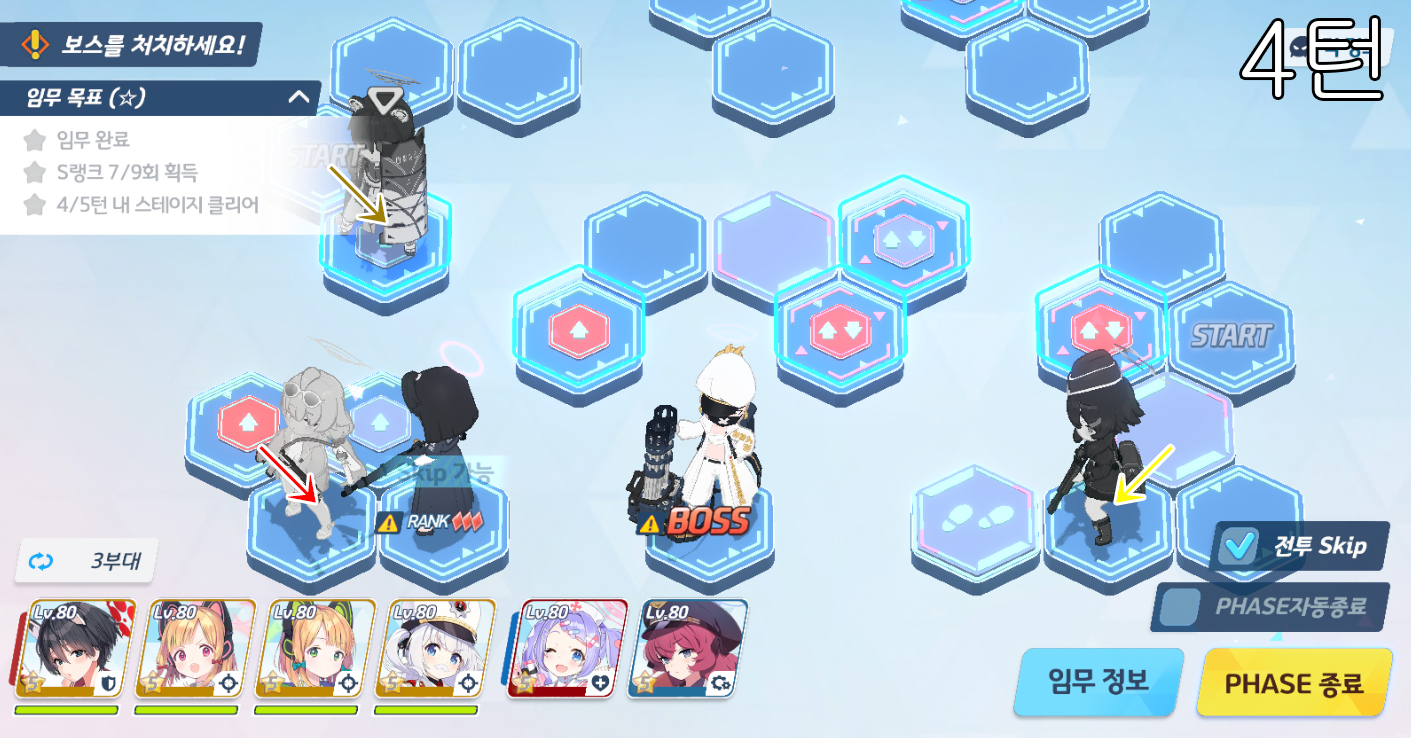 호시노 수영복이 오른쪽 1칸 이동하여 보스와 전투로 마무리가 됩니다.