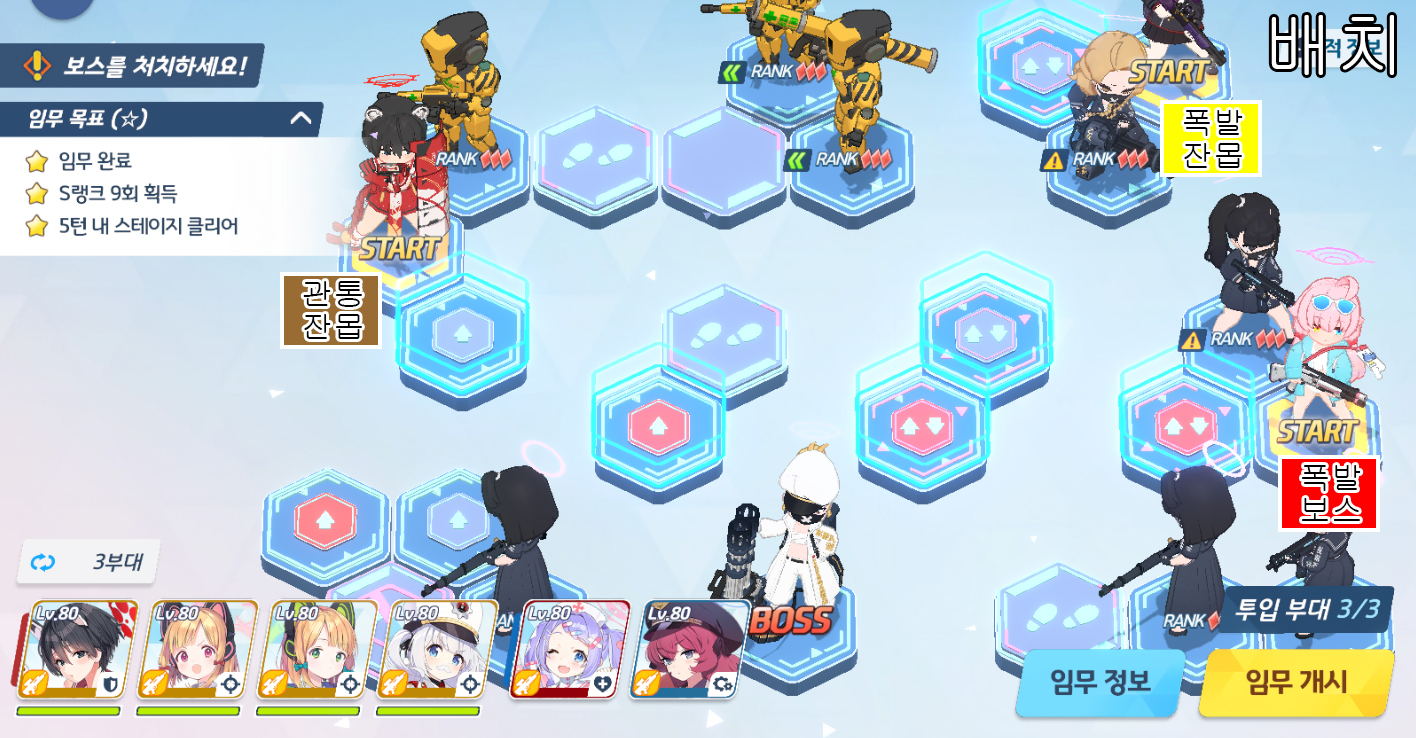 달콤한 비밀과 총격전 챌린지2 D.U. 슬럼가 일대 배치 수영복 호시노 => 폭발 보스 1팀 하루카 => 폭발 1팀 1턴 수영복 호시노 오른쪽 1칸 이동합니다. 하루카 왼쪽 아래 대각선 1칸 이동합니다. 2턴